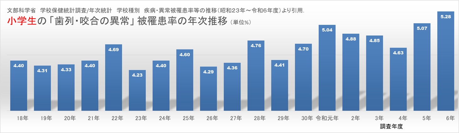 ※日本の子どもたちの 「歯列・咬合の異常」 は,独特の調査方法のため低く報告されている.それでも増加し続けている.